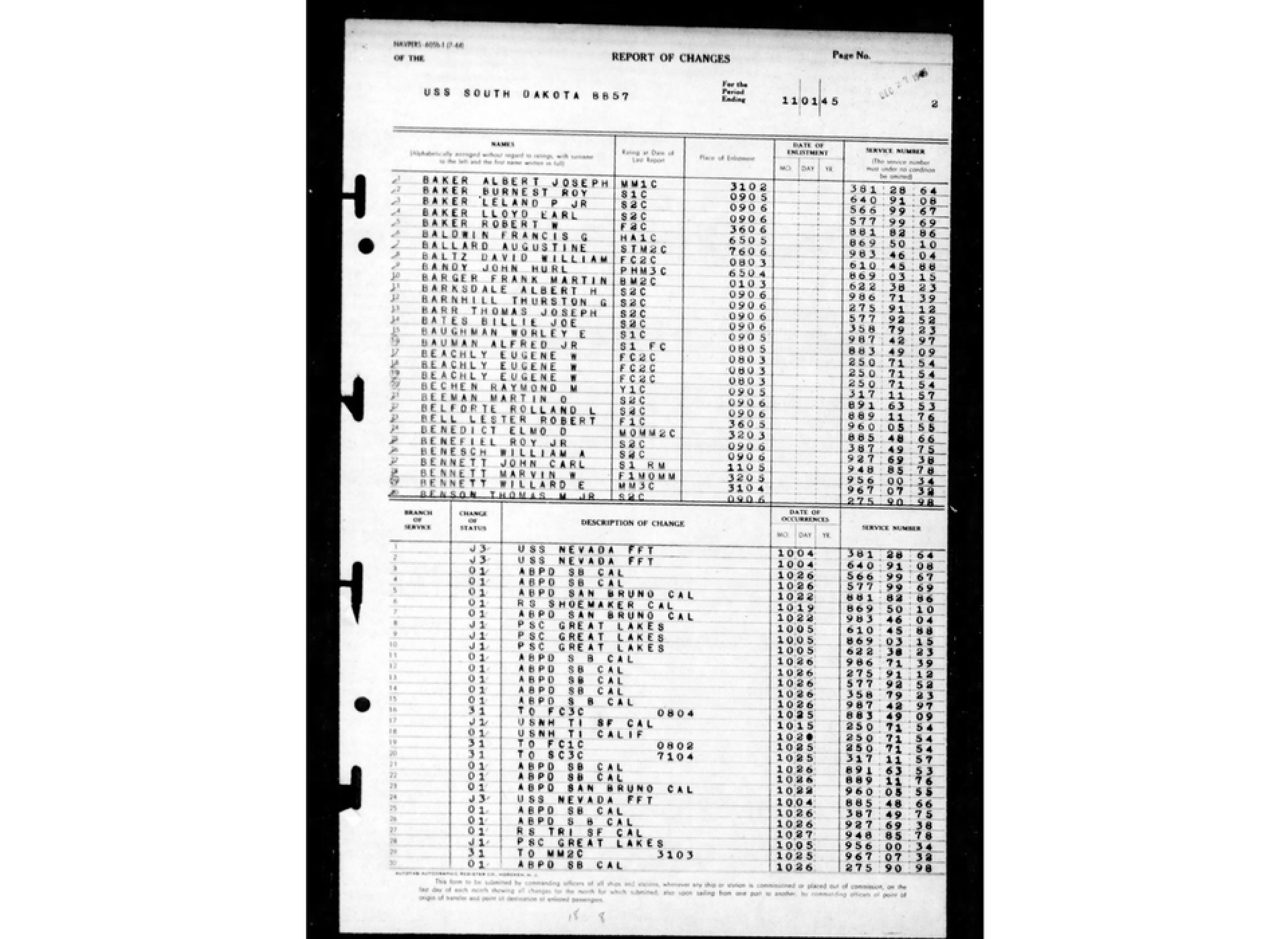 This Muster Roll, dated November 1, 1945, is a Report of Changes and shows Benson boarded the Dakota on October 26, 1945.