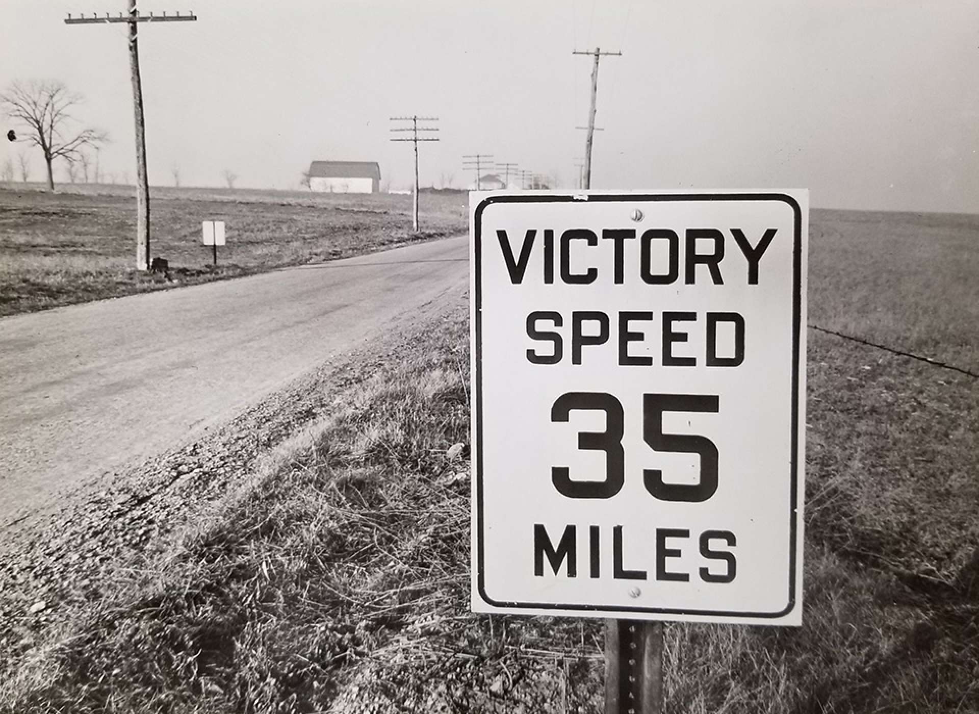 A road sign near Manheim, Pennsylvania posts the new “Victory Speed”—35 miles per hour in November of 1942. Courtesy Library of Congress.