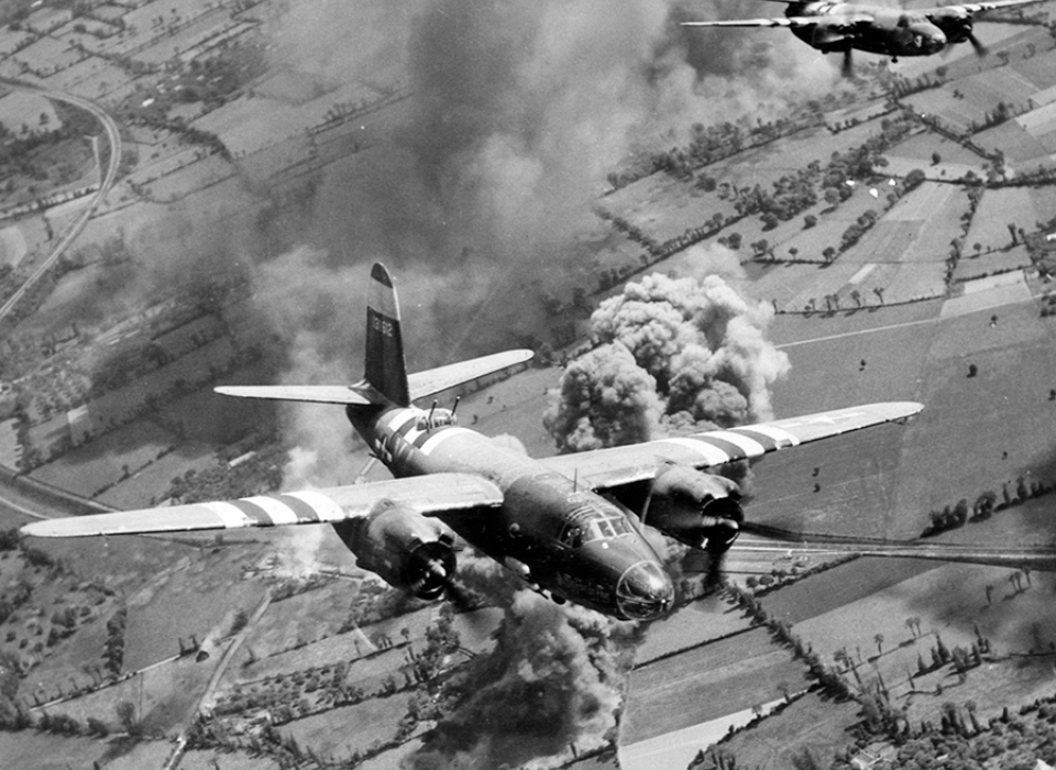 Top Photo: Two Marauder medium bombers of the Ninth Air Force leaving a road and rail junction behind the German lines battered by bomb bursts. U.S. National Archives NAID: 204894251