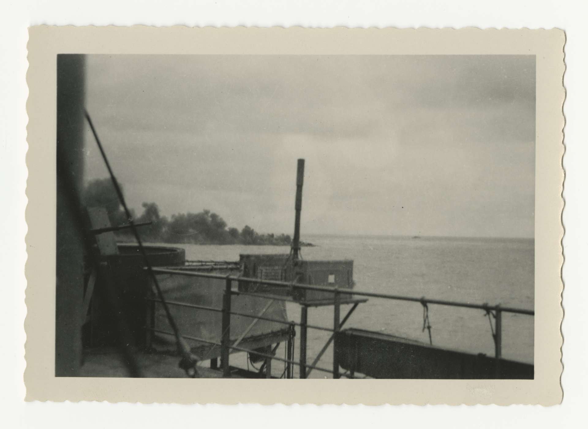Photo of smoke from the SS Mary Luckenbach, according to the note Nesser wrote on the back, the Mary Luckenbach took his ship’s place in Convoy PQ 18. 2012.015.084
