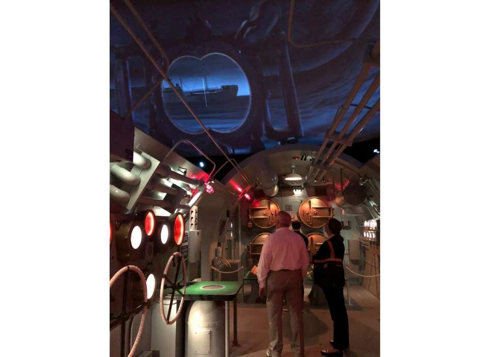 Not to reveal too much, but after the visitors are given their marching orders by Captain O’Kane (played by the actor Joel Lambert, whom we met in a previous post about our video shoot aboard the USS Ling) in the preshow chamber, they go to their “war stations” in the main chamber of the exhibit. The ceiling there is initially darkened but at an appropriate point in the story a 360-degree video screen comes to life over the heads of the “crew.” It depicts a submarine rising to the surface and then stealthily penetrating a Japanese convoy. As Captain O’Kane’s voice gives orders from the bridge, Tang fires her torpedoes and engages in a heated battle before speeding away to safety after landing devastating blows to the enemy. (As previously noted, Tang actually sank five enemy merchant ships on the night of October 24–25, 1944. The fifth was still listing on the surface when the Tang attempted to finish it off with her last two torpedoes, but the final shot was a defective torpedo that went into a circular run and struck Tang in the stern, sinking her).