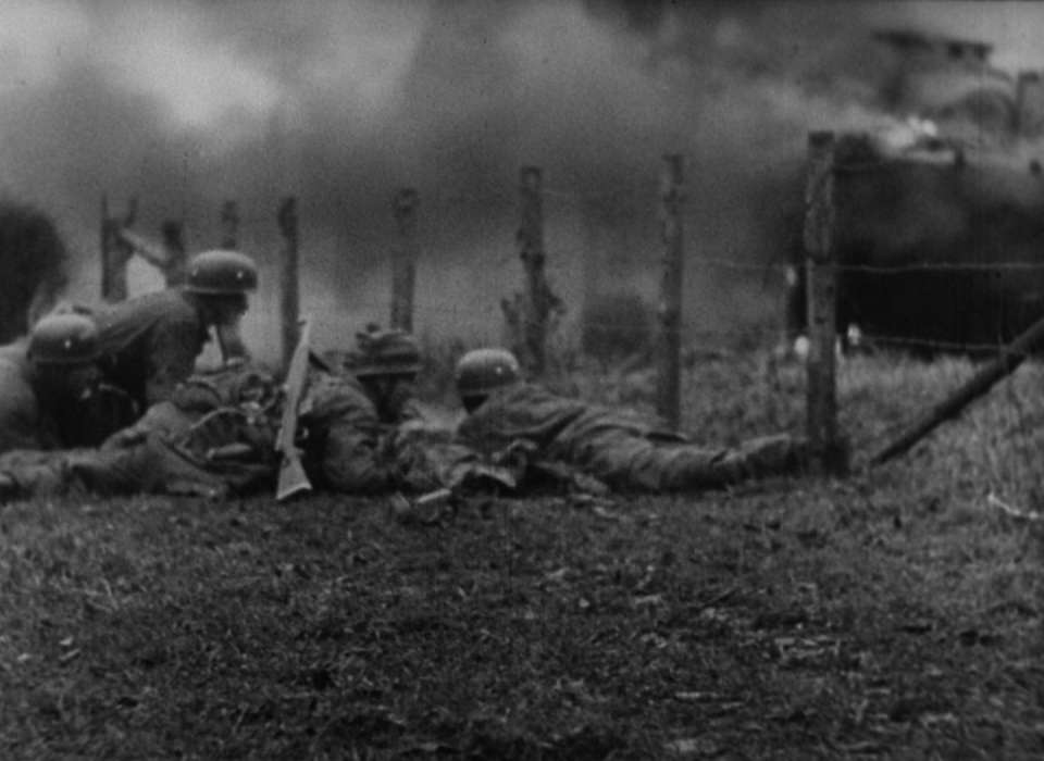German paratroopers take cover from American fire as they attempt to aid a wounded man. The National WWII Museum Digital Collections.