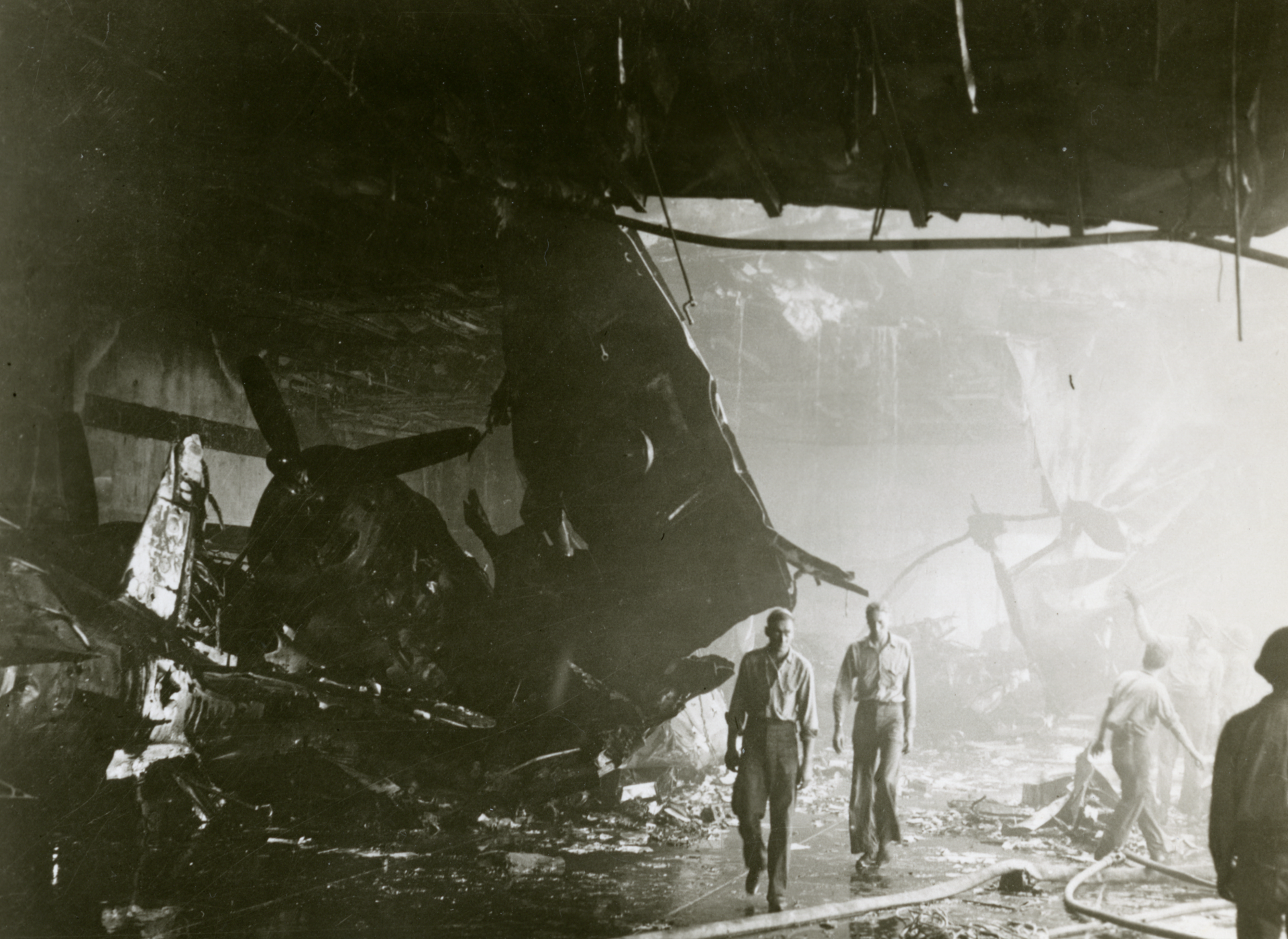 Sailors walk through the wrecked hangar deck of USS Bunker Hill (CV-17) following a kamikaze attack during the Battle of Okinawa. US Navy official photograph. The National WWII Museum, Gift of Thomas J. Hanlon, Accession #2013.495.412