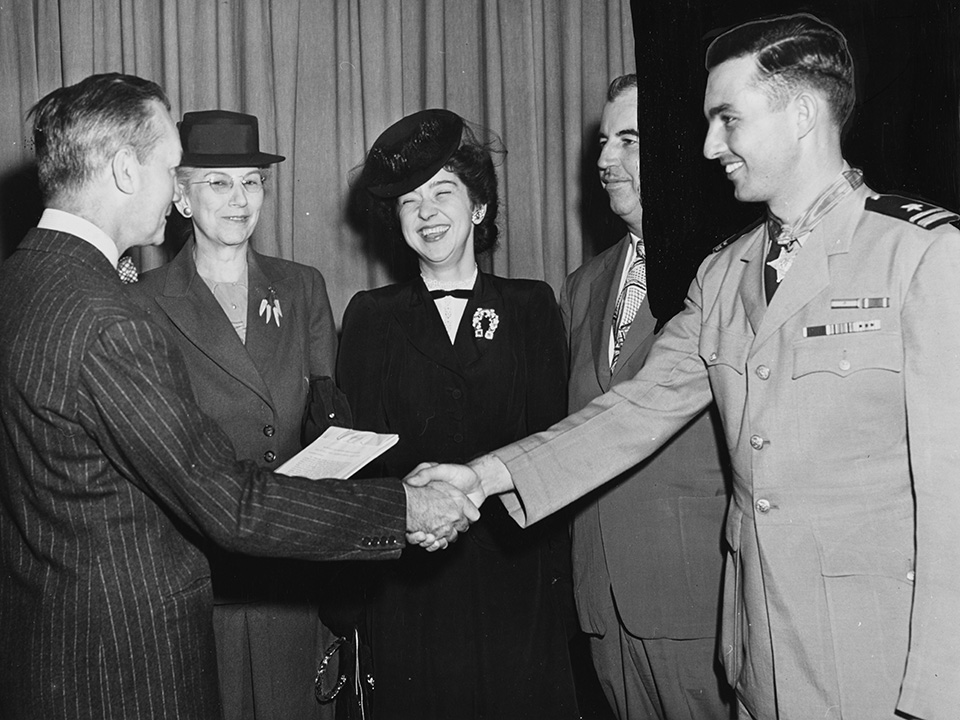 Lieutenant (jg) Rufus Herring shakes hands with Secretary of the Navy James Forrestal after accepting the Medal of Honor, September 1945. Courtesy Naval History and Heritage Command.
